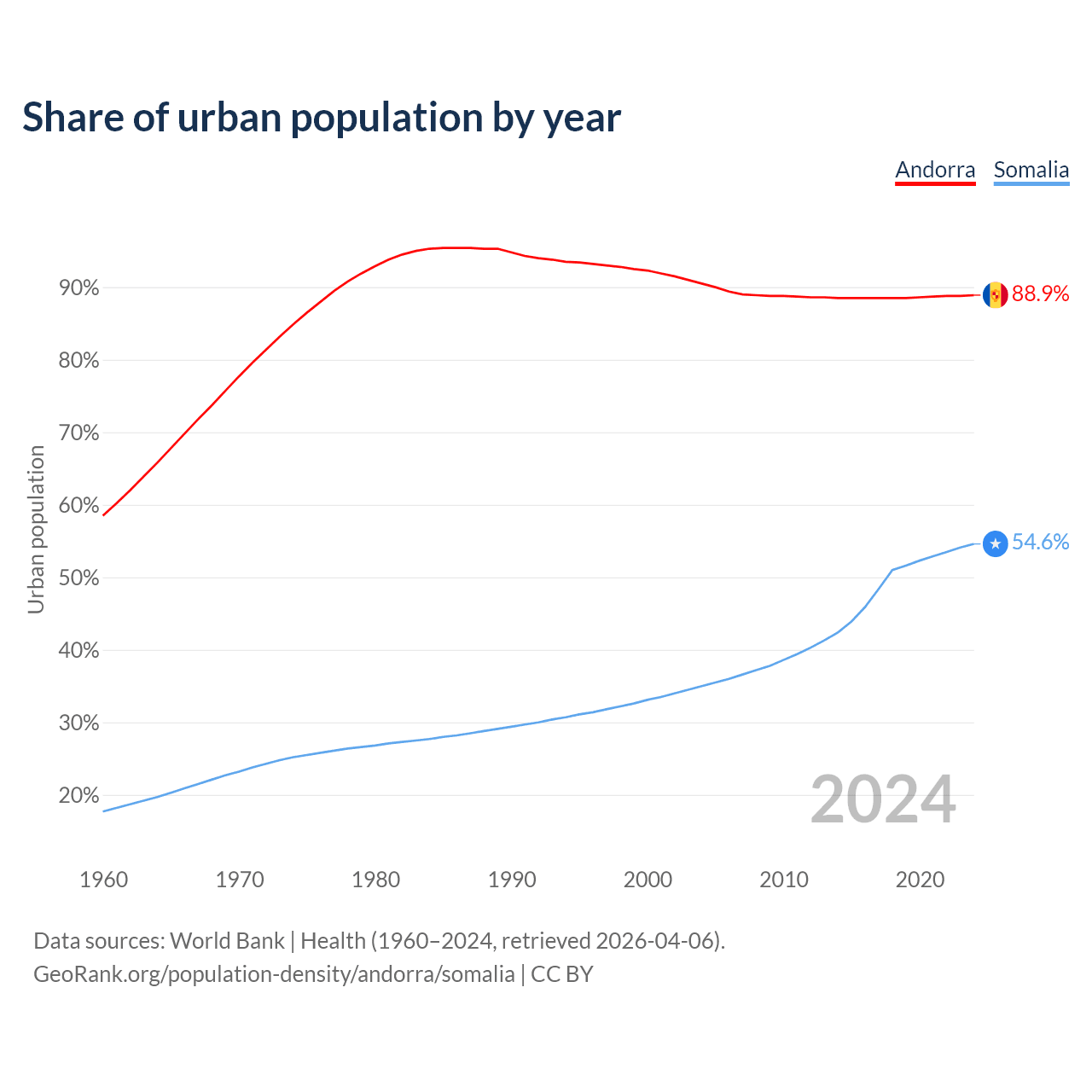 From 2004 to 2024, the share of urban population changed from 90.5% to 88.9% in Andorra and from 35% to 54.6% in Somalia.