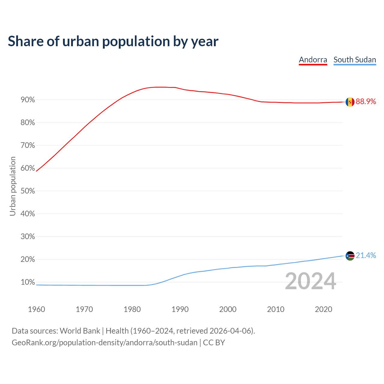 From 2004 to 2024, the share of urban population changed from 90.5% to 88.9% in Andorra and from 16.8% to 21.4% in South Sudan.