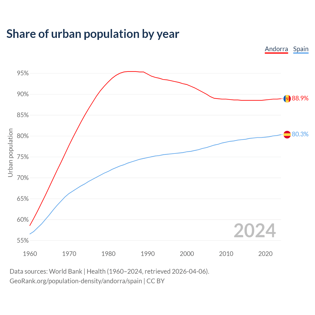 From 2004 to 2024, the share of urban population changed from 90.5% to 88.9% in Andorra and from 77% to 80.3% in Spain.