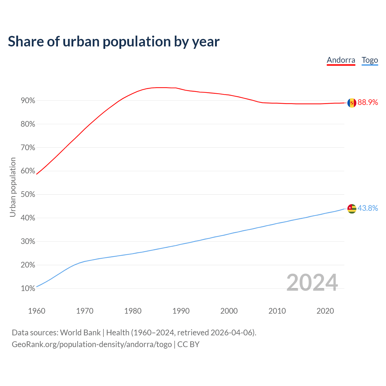 From 2004 to 2024, the share of urban population changed from 90.5% to 88.9% in Andorra and from 34.9% to 43.8% in Togo.