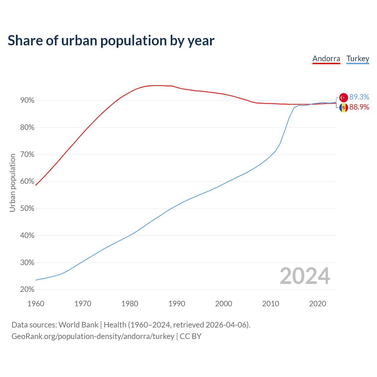 From 2004 to 2024, the share of urban population changed from 90.5% to 88.9% in Andorra and from 62.4% to 89.3% in Turkey.