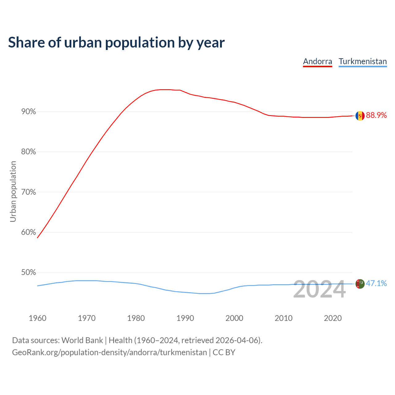 From 2004 to 2024, the share of urban population changed from 90.5% to 88.9% in Andorra and from 46.7% to 47.1% in Turkmenistan.