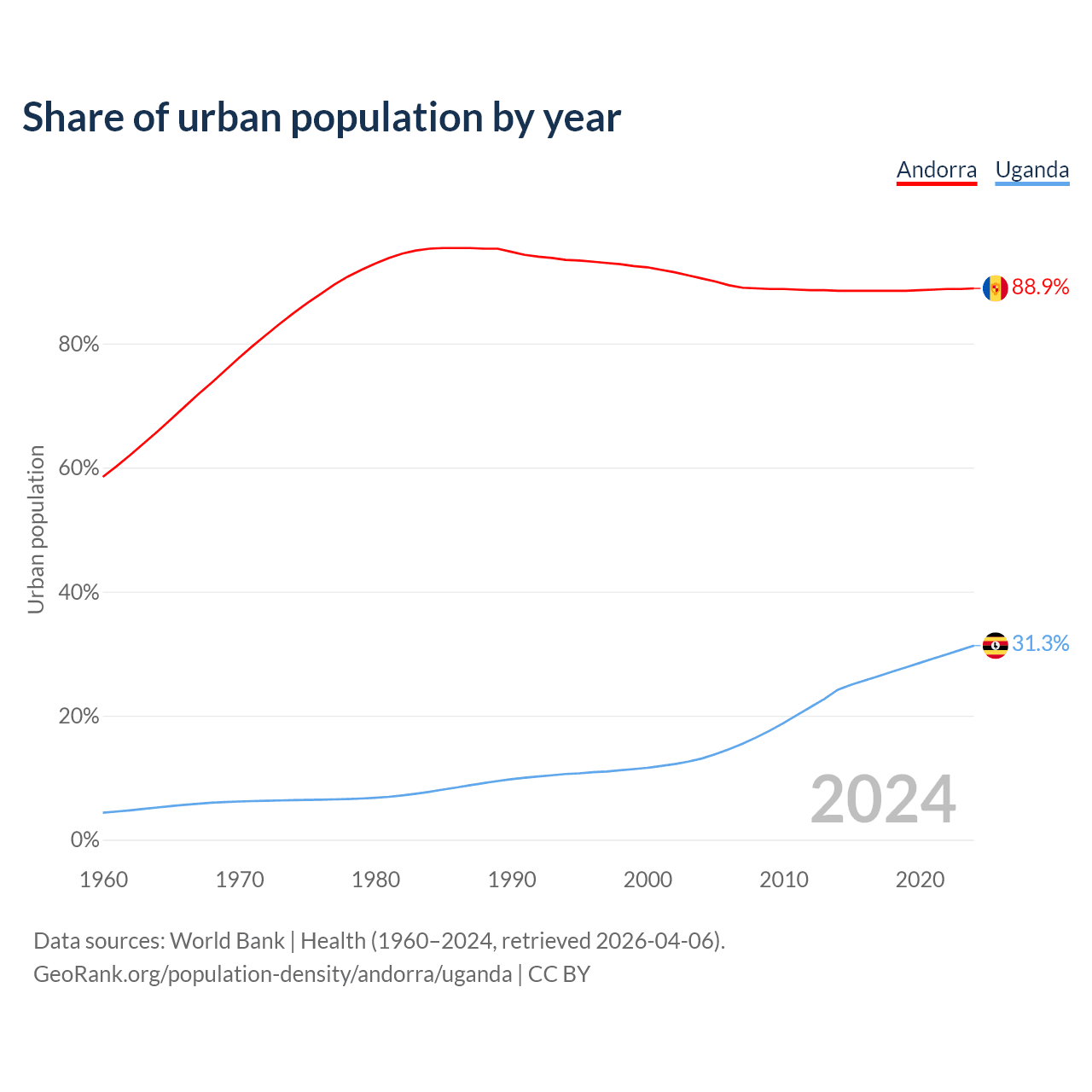 From 2004 to 2024, the share of urban population changed from 90.5% to 88.9% in Andorra and from 13.1% to 31.3% in Uganda.