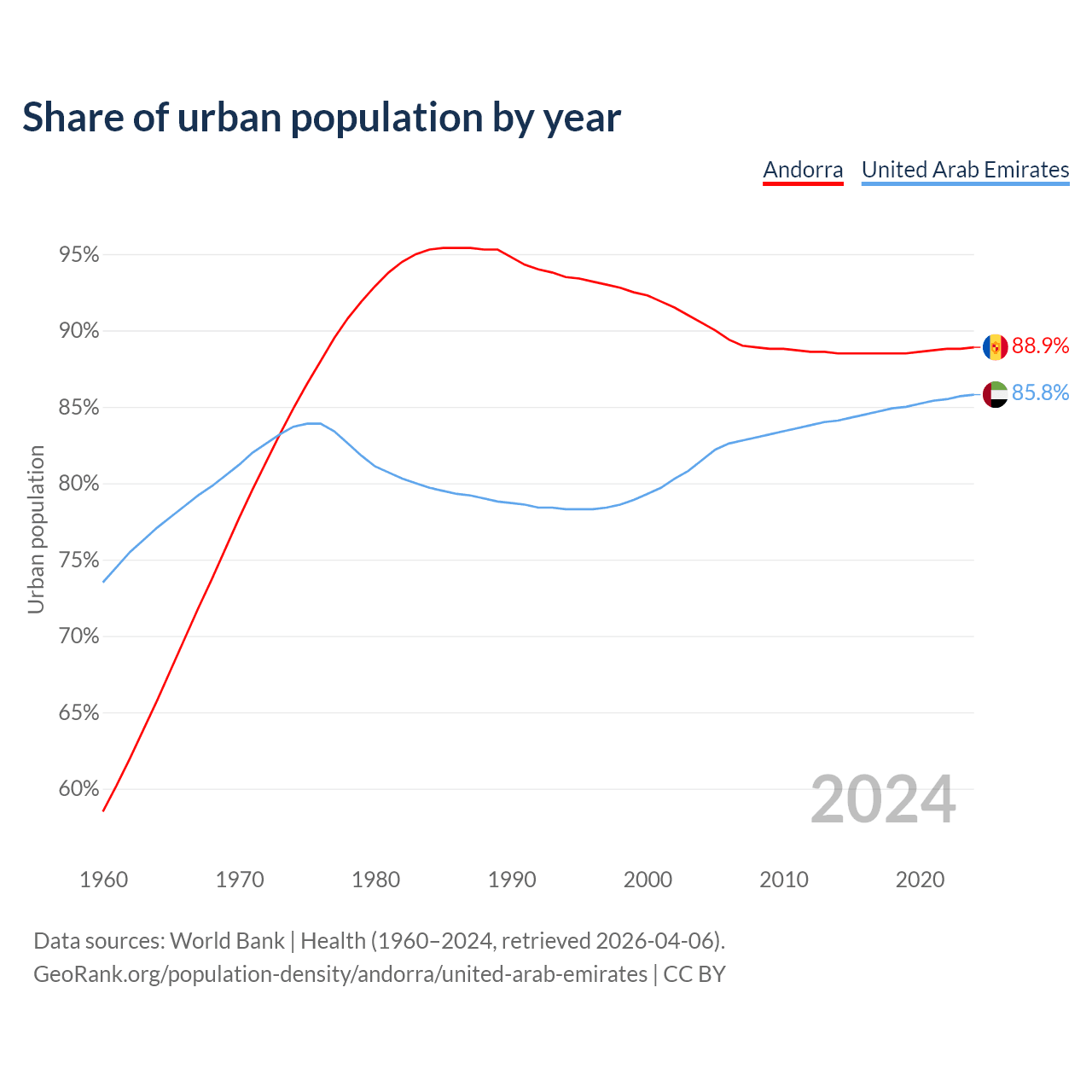 From 2004 to 2024, the share of urban population changed from 90.5% to 88.9% in Andorra and from 81.5% to 85.8% in the United Arab Emirates.