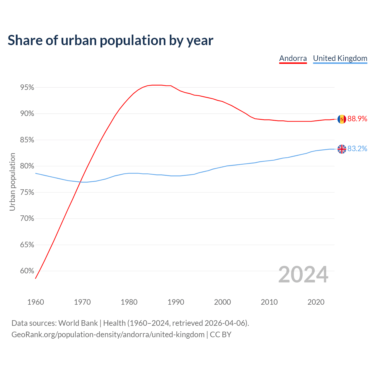 From 2004 to 2024, the share of urban population changed from 90.5% to 88.9% in Andorra and from 80.3% to 83.2% in the United Kingdom.