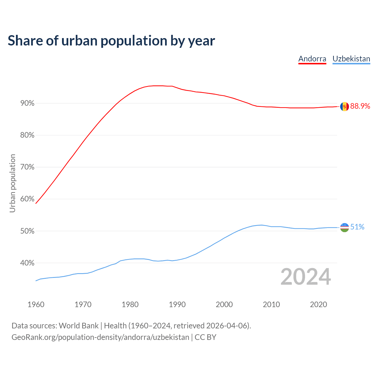 From 2004 to 2024, the share of urban population changed from 90.5% to 88.9% in Andorra and from 50.6% to 51% in Uzbekistan.