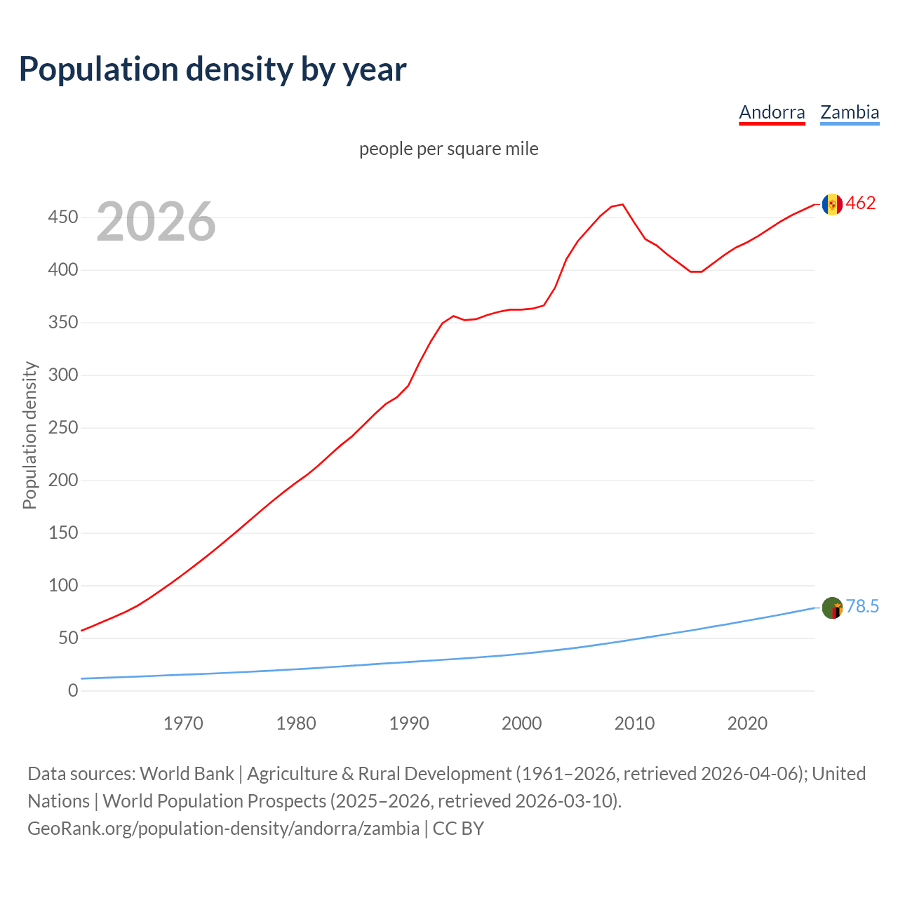 From 2006 to 2026, population density in Andorra increased by 5.4%, compared to a 85.7% growth in Zambia.