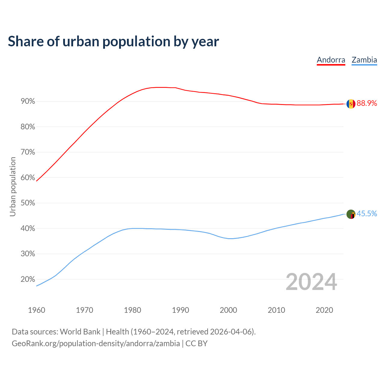From 2004 to 2024, the share of urban population changed from 90.5% to 88.9% in Andorra and from 36.8% to 45.5% in Zambia.