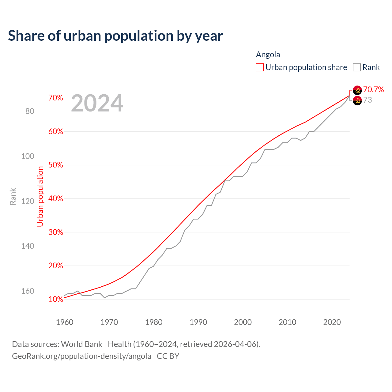 This chart shows the share of urban population in Angola from 1960 to 2024: 10.4% lived in urban areas in 1960, 50.5% in 2000, and 70.7% in 2024.