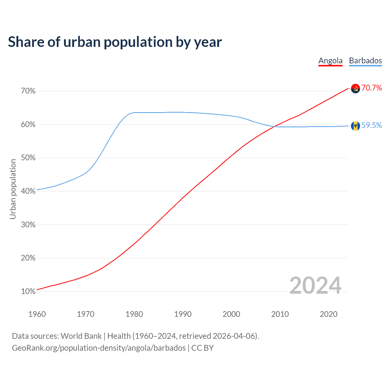 From 2004 to 2024, the share of urban population changed from 55% to 70.7% in Angola and from 61.1% to 59.5% in Barbados.