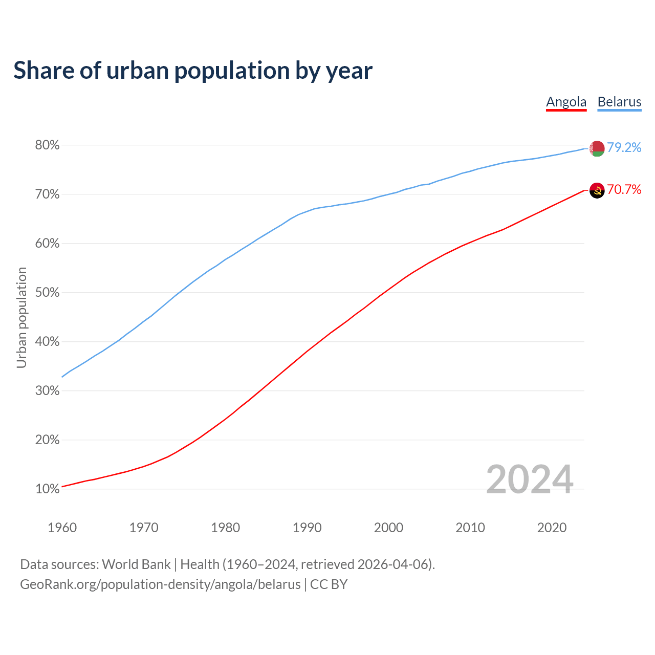 From 2004 to 2024, the share of urban population changed from 55% to 70.7% in Angola and from 71.8% to 79.2% in Belarus.
