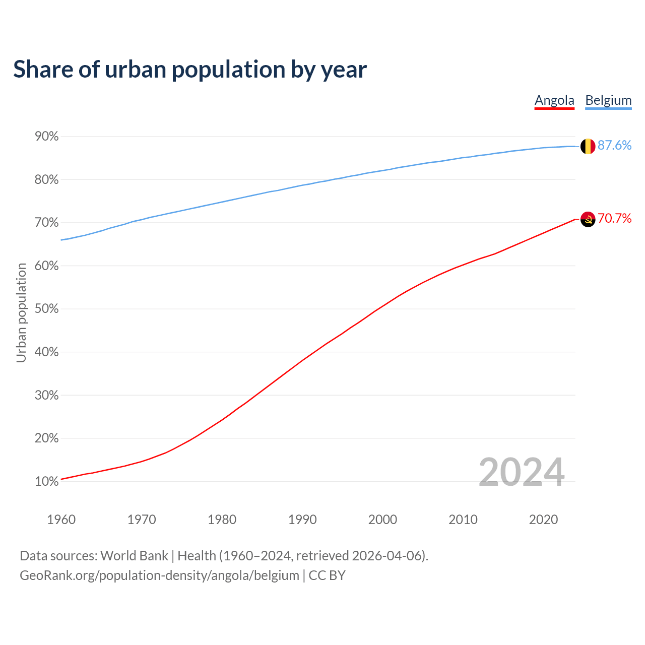 From 2004 to 2024, the share of urban population changed from 55% to 70.7% in Angola and from 83.3% to 87.6% in Belgium.