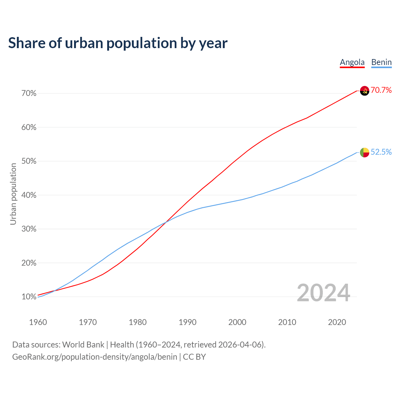 From 2004 to 2024, the share of urban population changed from 55% to 70.7% in Angola and from 39.9% to 52.5% in Benin.