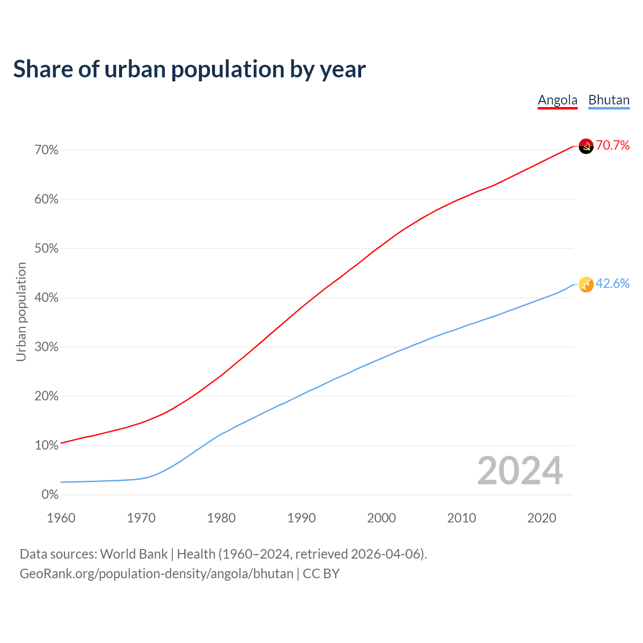 From 2004 to 2024, the share of urban population changed from 55% to 70.7% in Angola and from 30.3% to 42.6% in Bhutan.