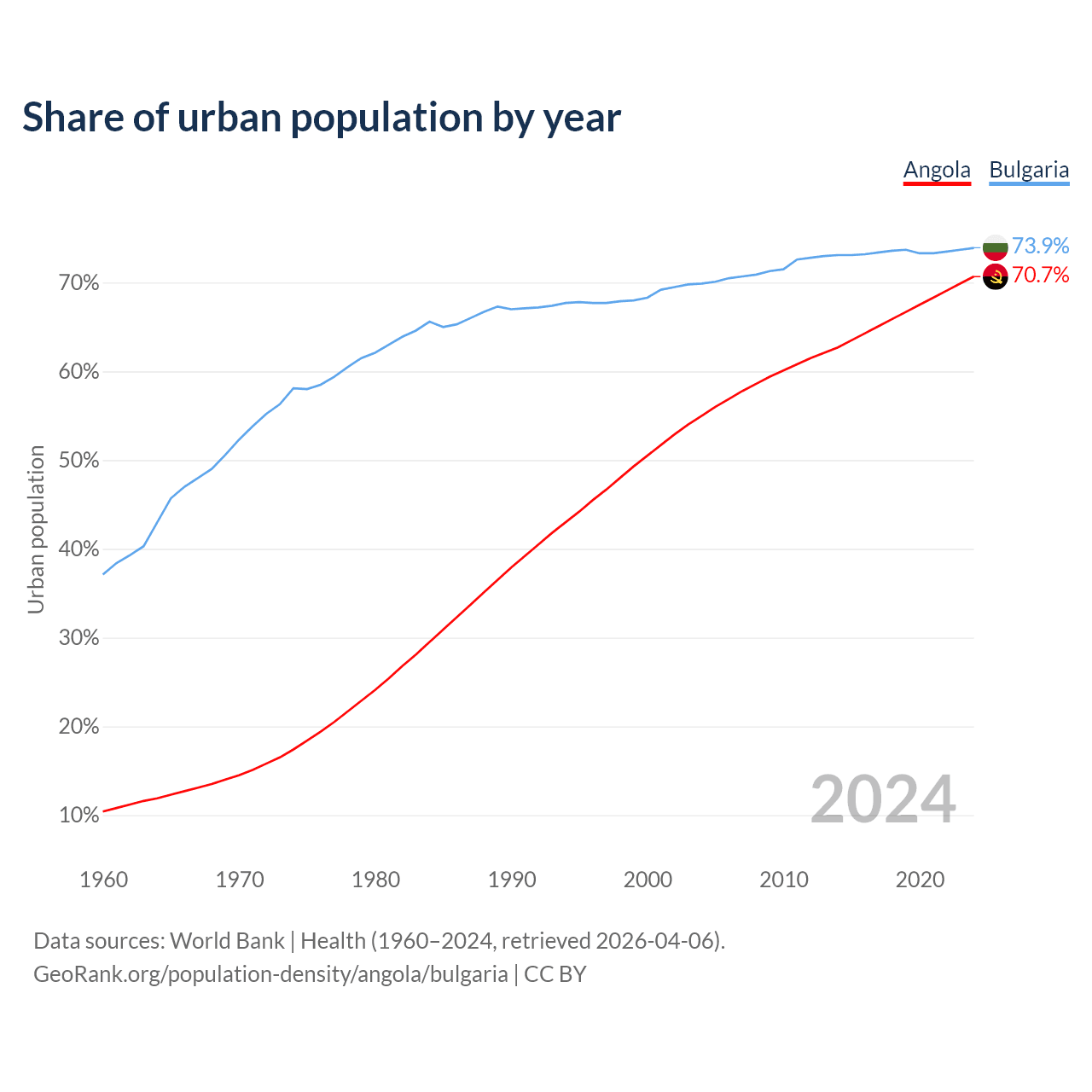 From 2004 to 2024, the share of urban population changed from 55% to 70.7% in Angola and from 69.9% to 73.9% in Bulgaria.