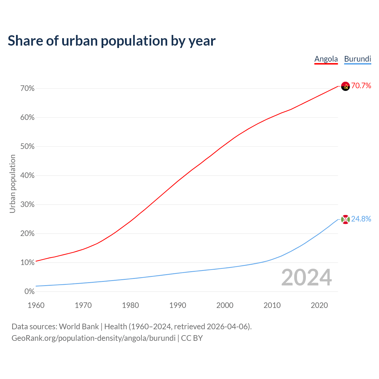 From 2004 to 2024, the share of urban population changed from 55% to 70.7% in Angola and from 8.92% to 24.8% in Burundi.