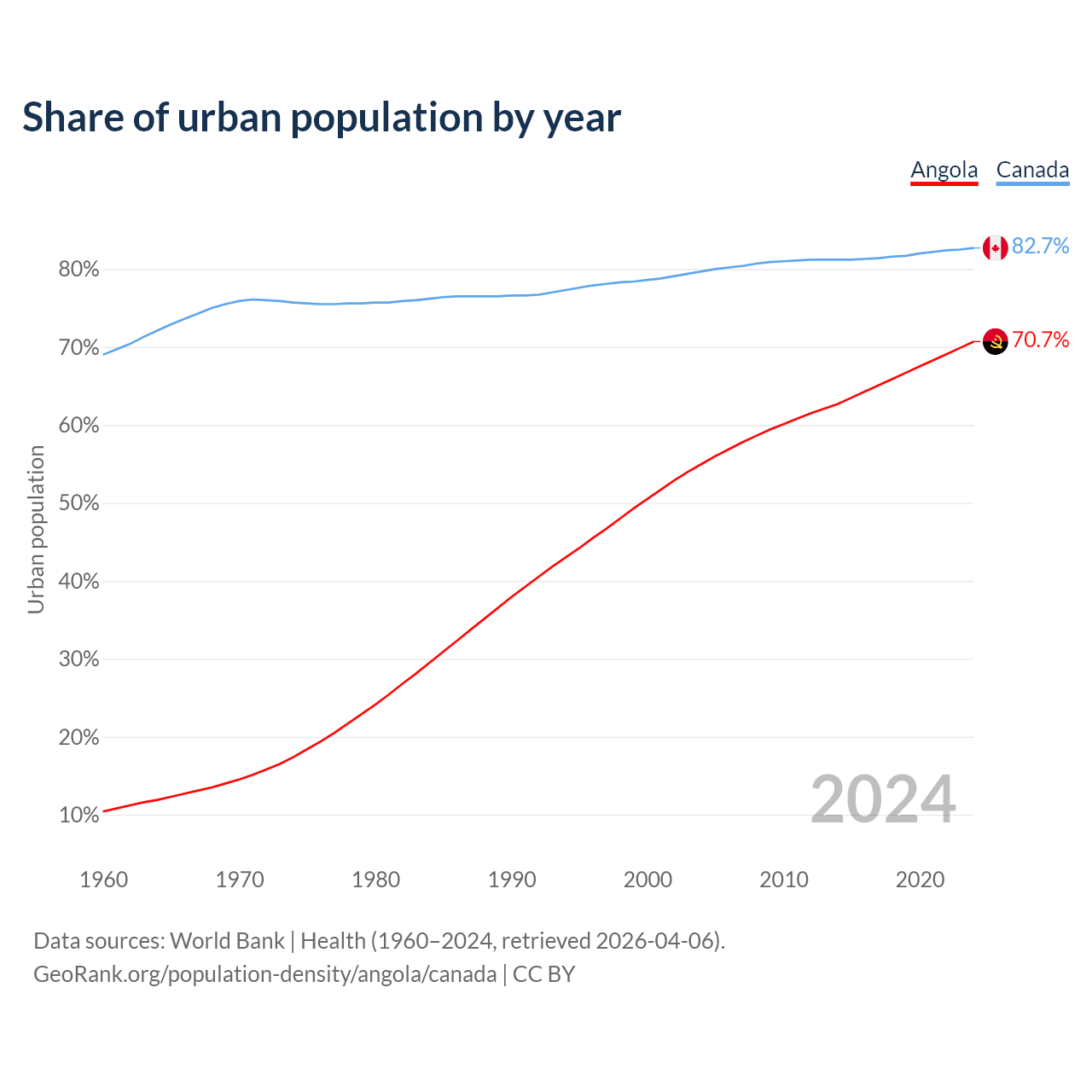 From 2004 to 2024, the share of urban population changed from 55% to 70.7% in Angola and from 79.7% to 82.7% in Canada.