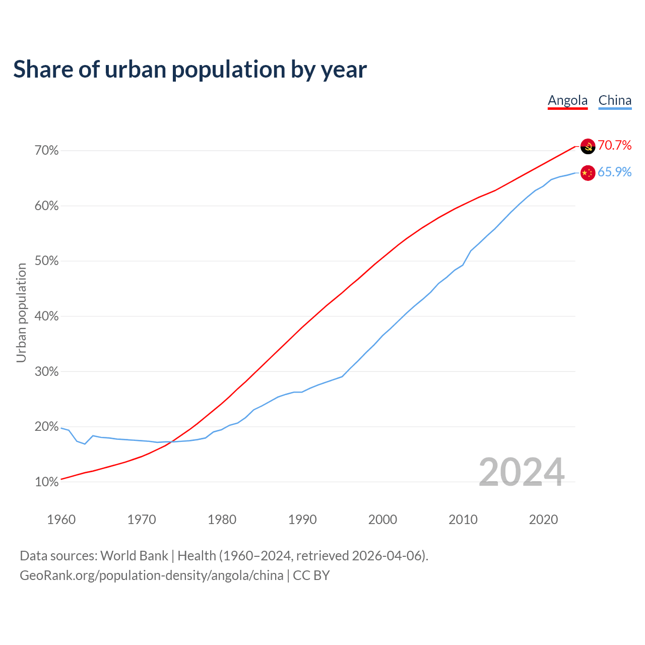 From 2004 to 2024, the share of urban population changed from 55% to 70.7% in Angola and from 41.8% to 65.9% in China.