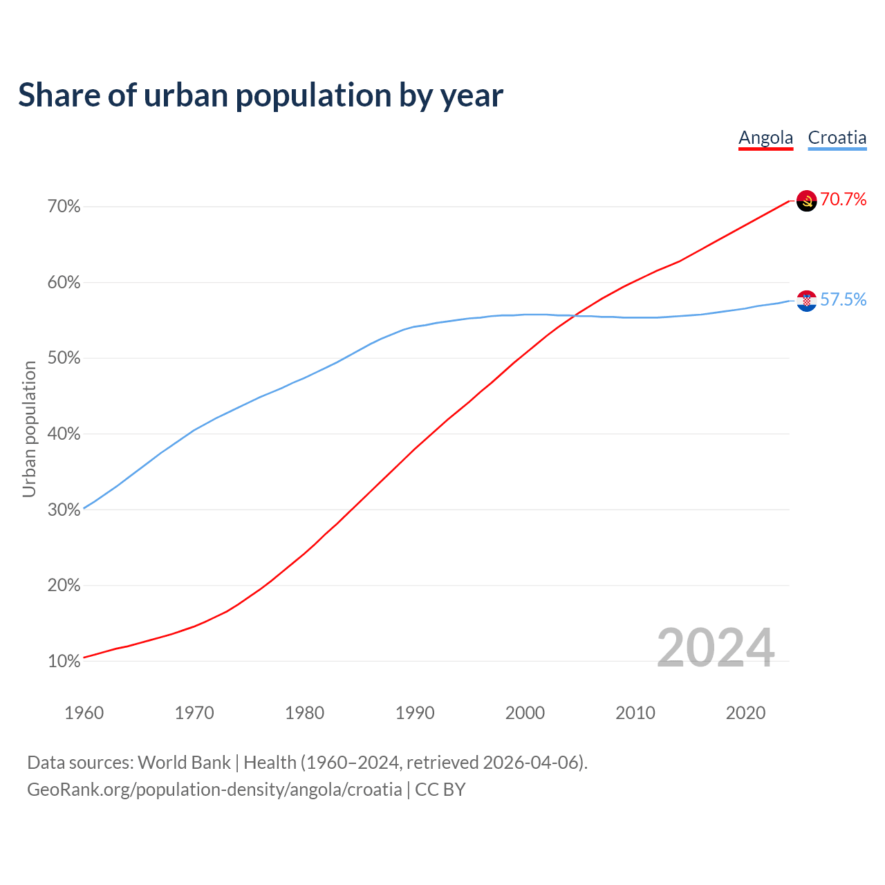 From 2004 to 2024, the share of urban population changed from 55% to 70.7% in Angola and from 55.6% to 57.5% in Croatia.