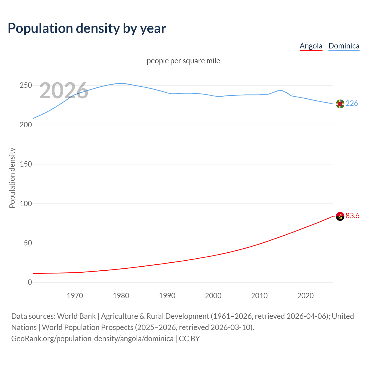 From 2006 to 2026, population density in Angola increased by 101%, compared to a 4.75% decline in Dominica.