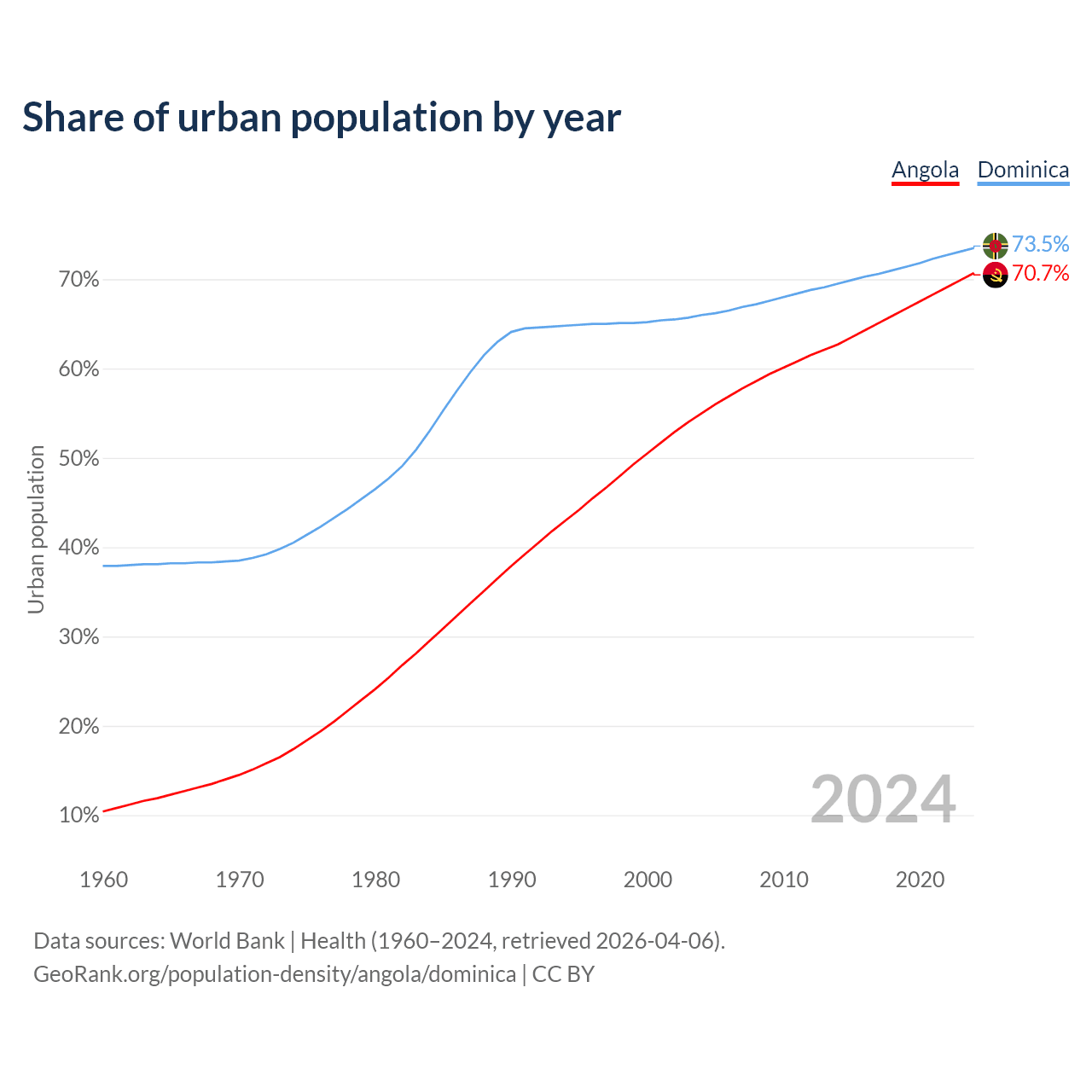 From 2004 to 2024, the share of urban population changed from 55% to 70.7% in Angola and from 66% to 73.5% in Dominica.