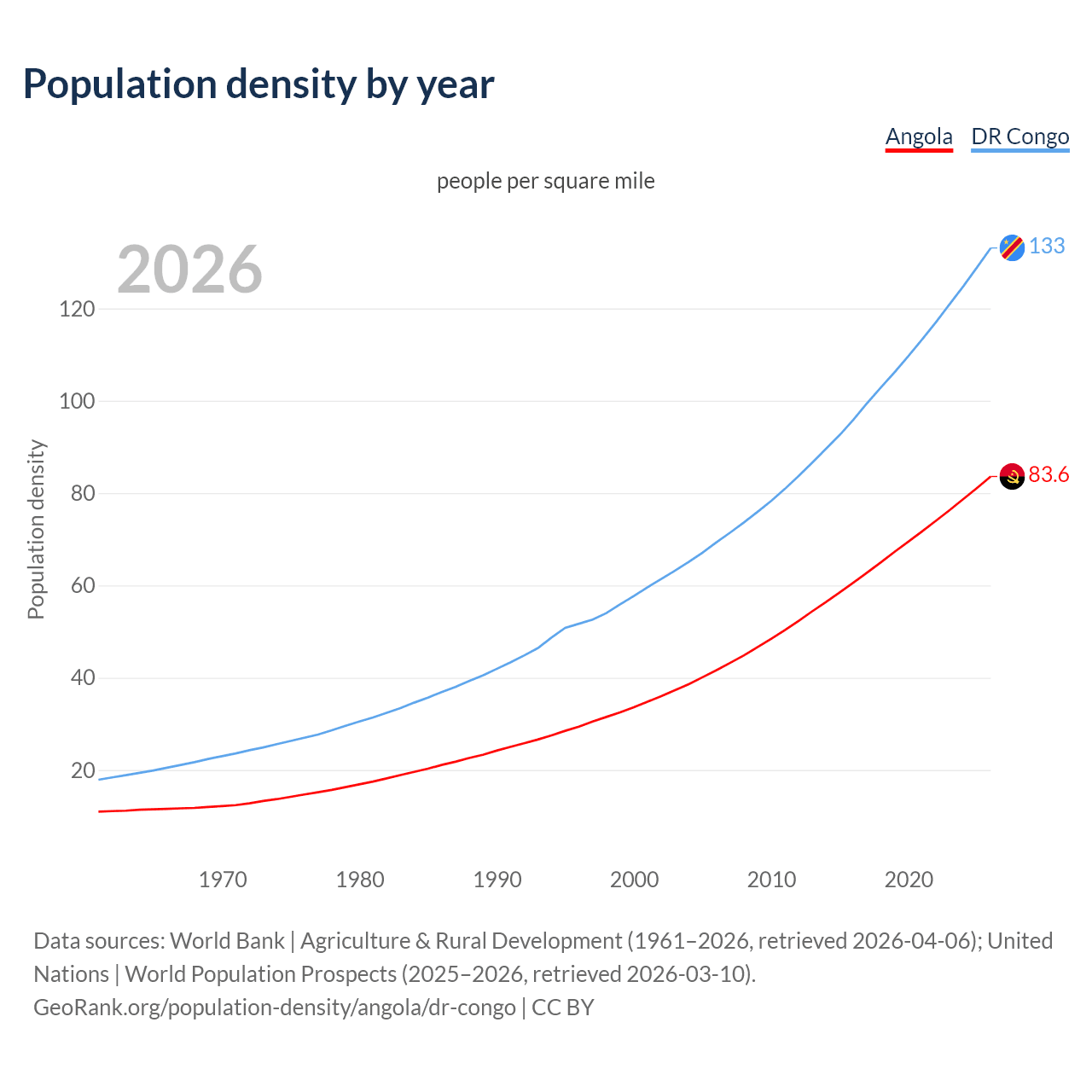 From 2006 to 2026, population density in Angola increased by 101%, compared to a 92.2% growth in the DR Congo.