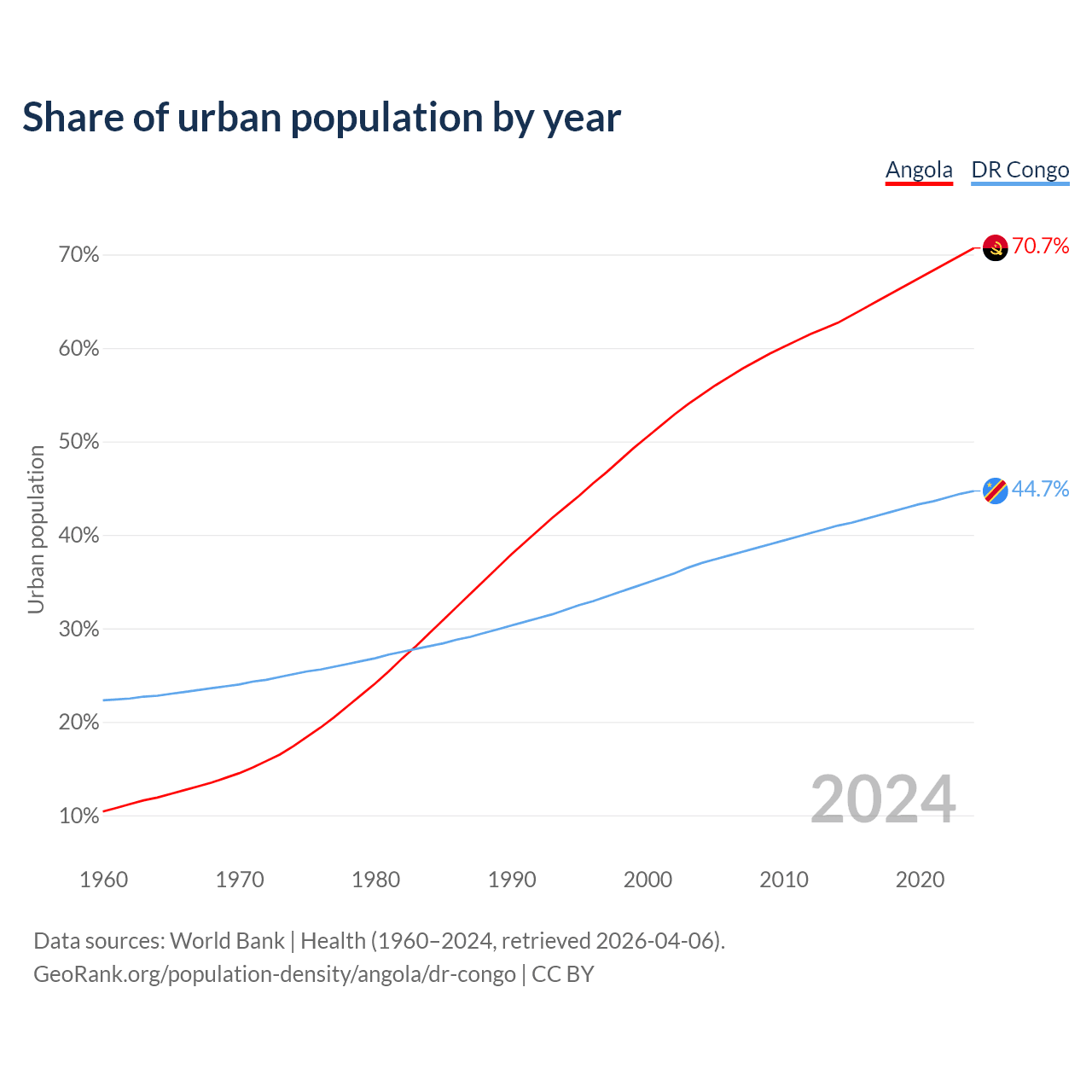 From 2004 to 2024, the share of urban population changed from 55% to 70.7% in Angola and from 37% to 44.7% in the DR Congo.