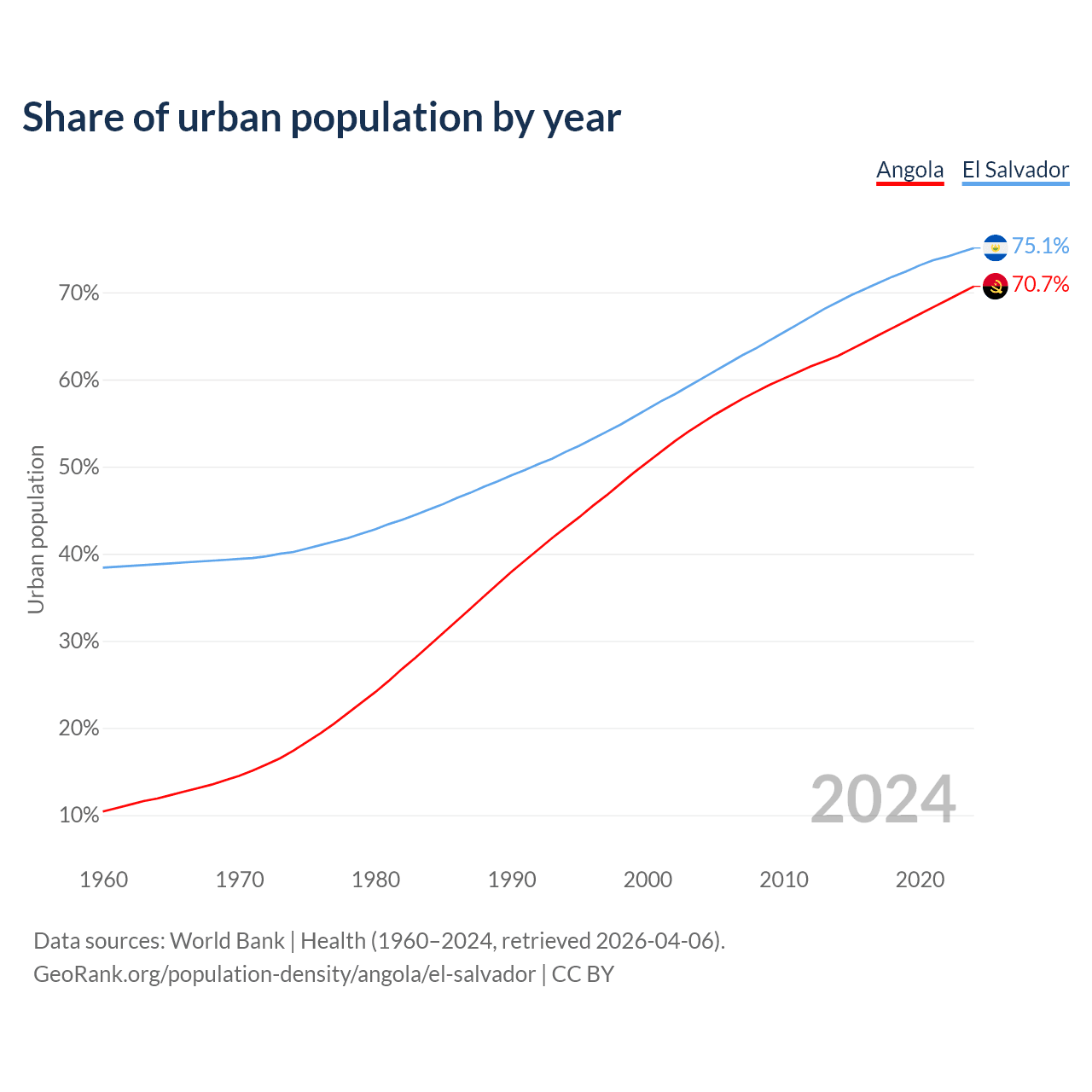 From 2004 to 2024, the share of urban population changed from 55% to 70.7% in Angola and from 60.1% to 75.1% in El Salvador.