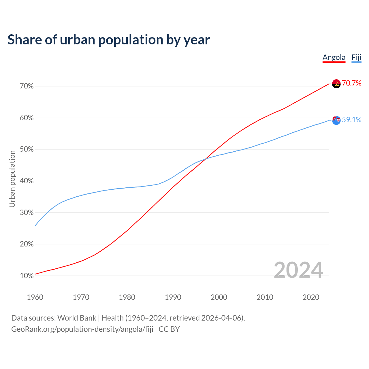 From 2004 to 2024, the share of urban population changed from 55% to 70.7% in Angola and from 49.5% to 59.1% in Fiji.
