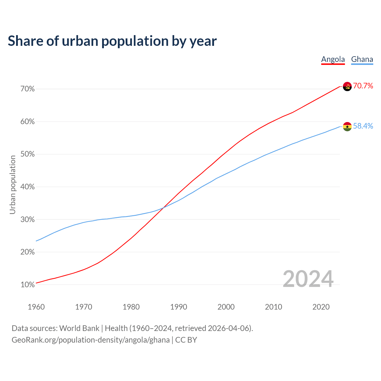 From 2004 to 2024, the share of urban population changed from 55% to 70.7% in Angola and from 46.8% to 58.4% in Ghana.