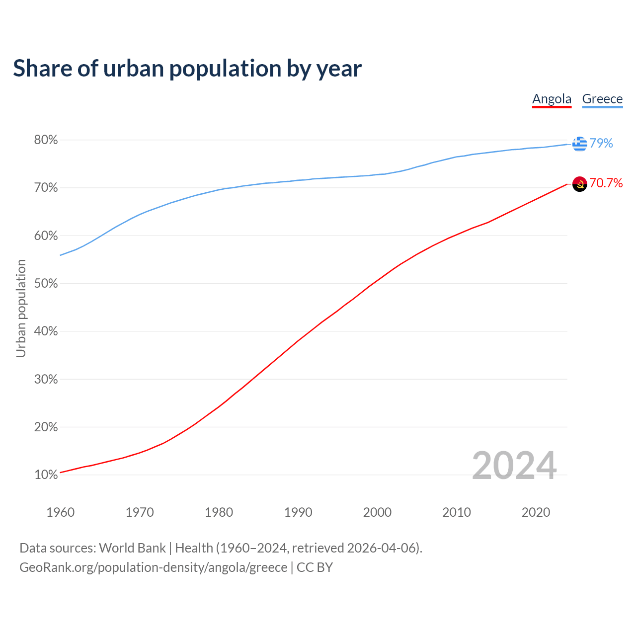 From 2004 to 2024, the share of urban population changed from 55% to 70.7% in Angola and from 73.8% to 79% in Greece.