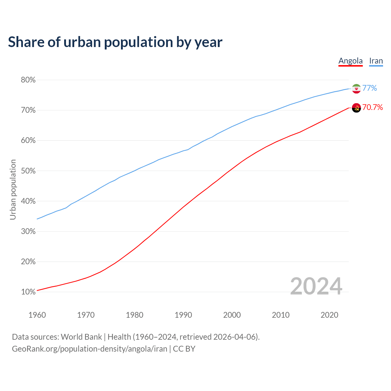 From 2004 to 2024, the share of urban population changed from 55% to 70.7% in Angola and from 67.3% to 77% in Iran.