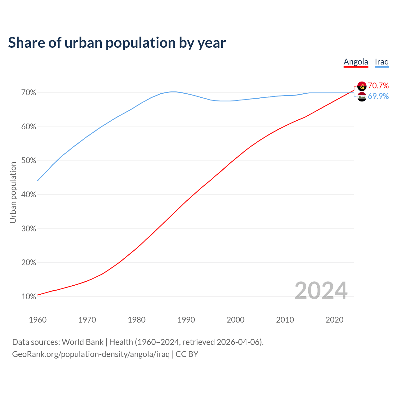 From 2004 to 2024, the share of urban population changed from 55% to 70.7% in Angola and from 68.2% to 69.9% in Iraq.