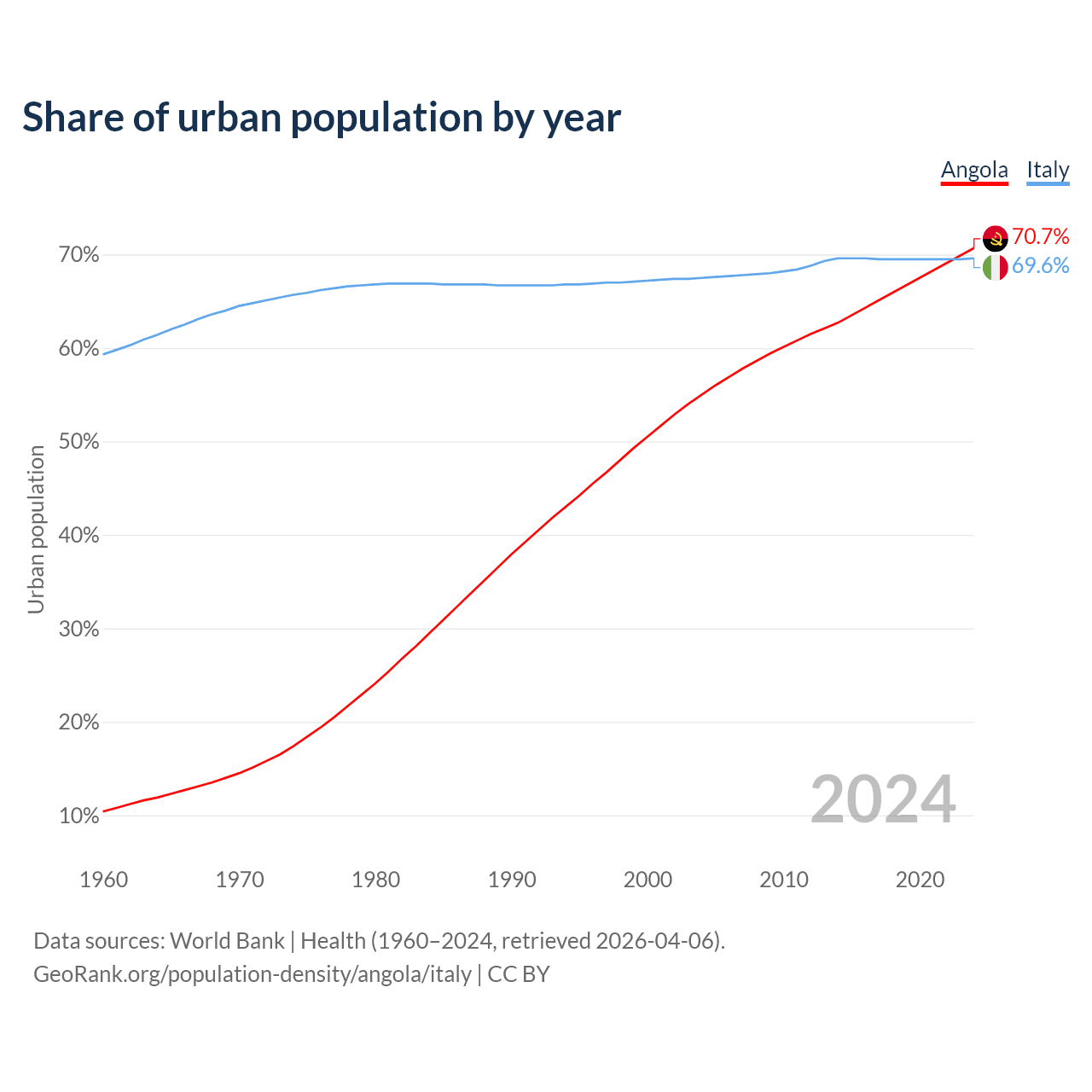 From 2004 to 2024, the share of urban population changed from 55% to 70.7% in Angola and from 67.5% to 69.6% in Italy.