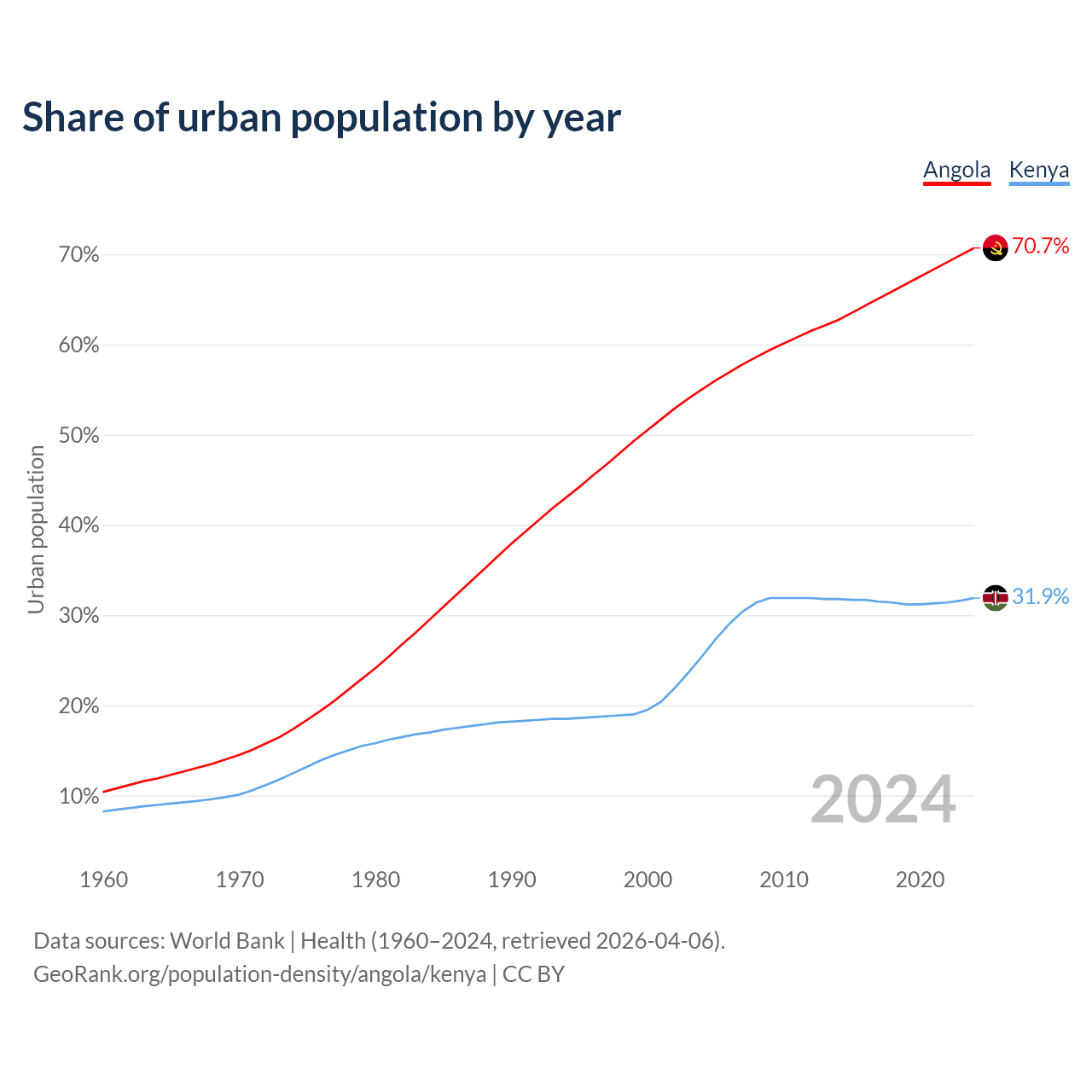 From 2004 to 2024, the share of urban population changed from 55% to 70.7% in Angola and from 25.4% to 31.9% in Kenya.