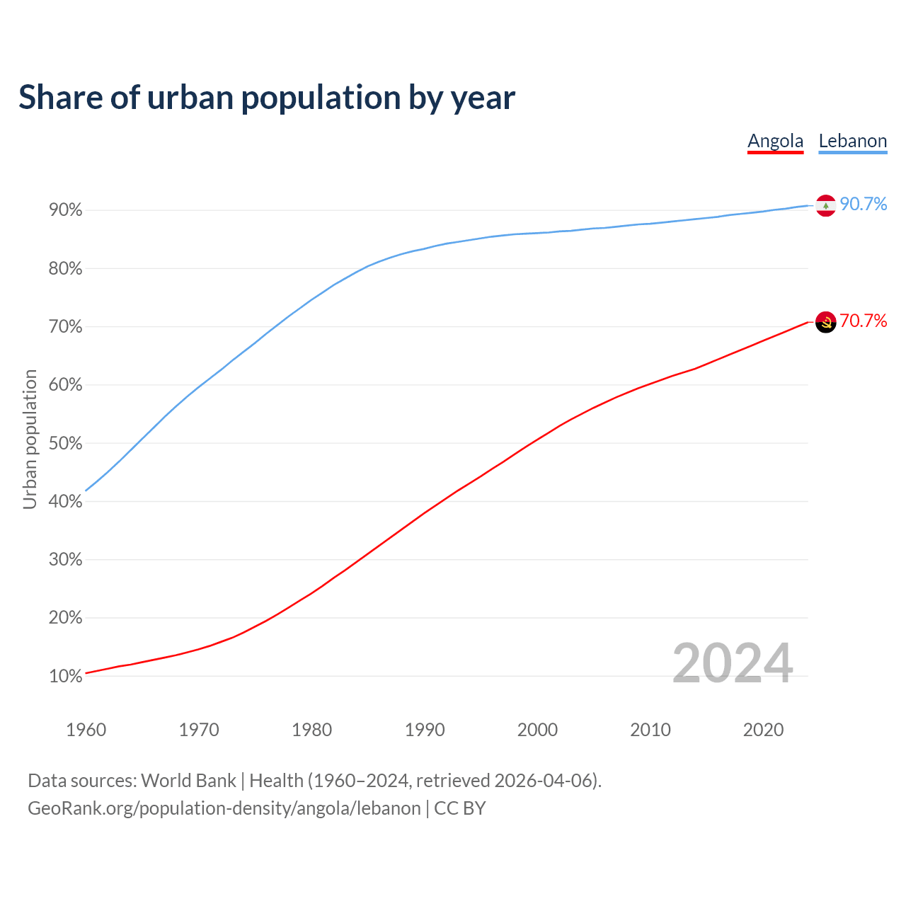 From 2004 to 2024, the share of urban population changed from 55% to 70.7% in Angola and from 86.6% to 90.7% in Lebanon.