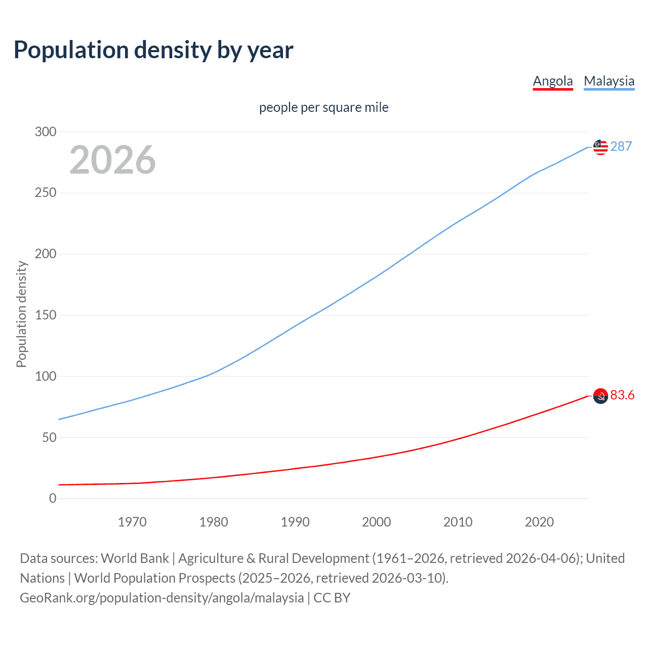 From 2006 to 2026, population density in Angola increased by 101%, compared to a 37.8% growth in Malaysia.