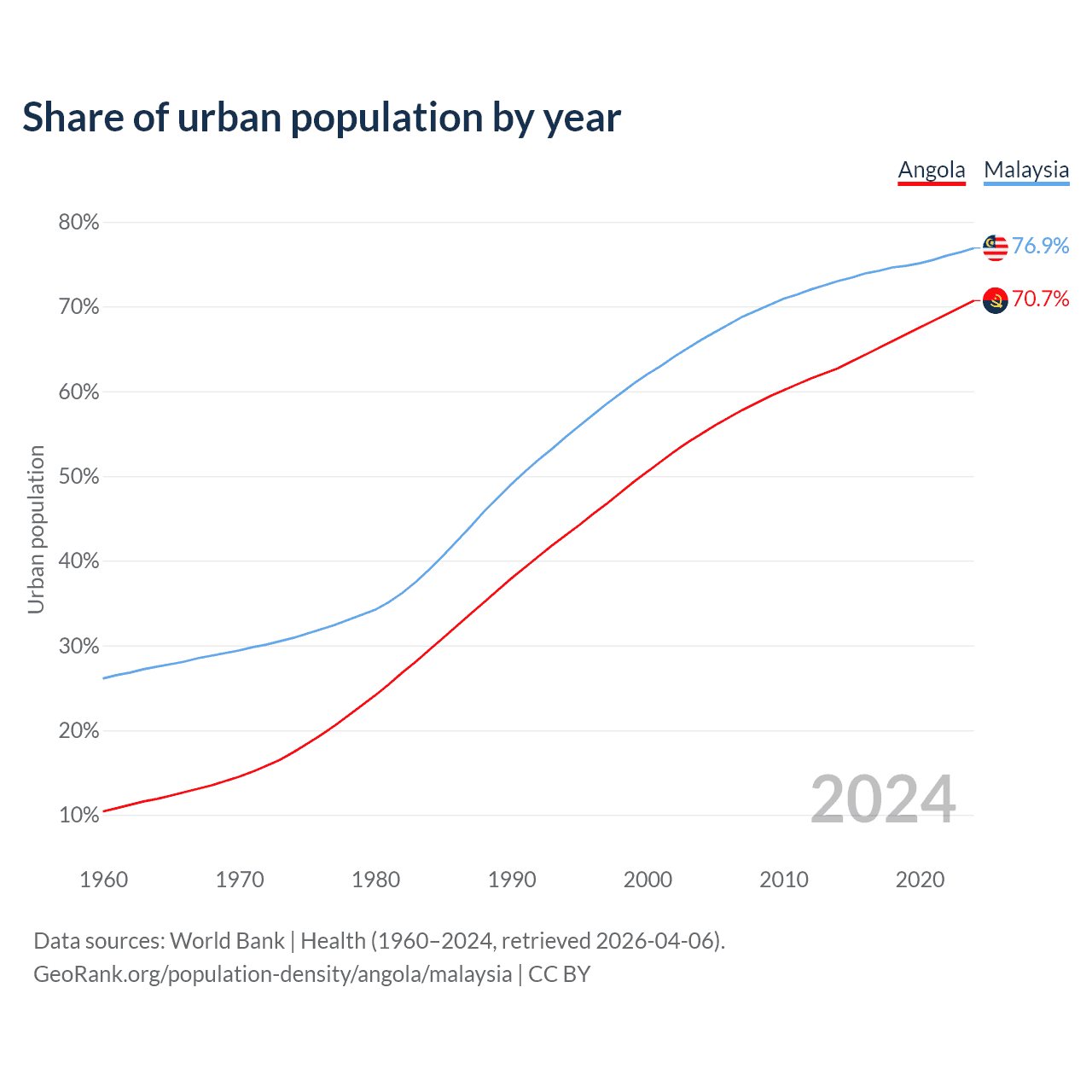 From 2004 to 2024, the share of urban population changed from 55% to 70.7% in Angola and from 66.1% to 76.9% in Malaysia.