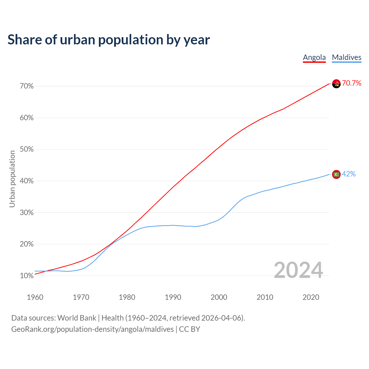 From 2004 to 2024, the share of urban population changed from 55% to 70.7% in Angola and from 32.9% to 42% in Maldives.