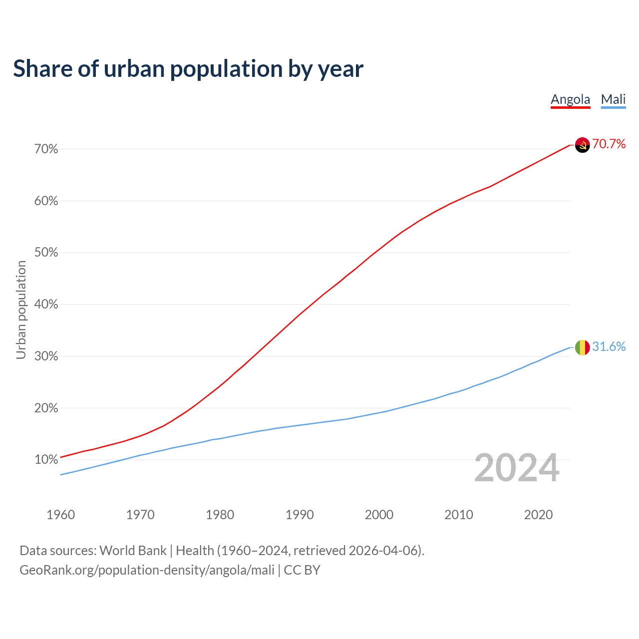 From 2004 to 2024, the share of urban population changed from 55% to 70.7% in Angola and from 20.5% to 31.6% in Mali.