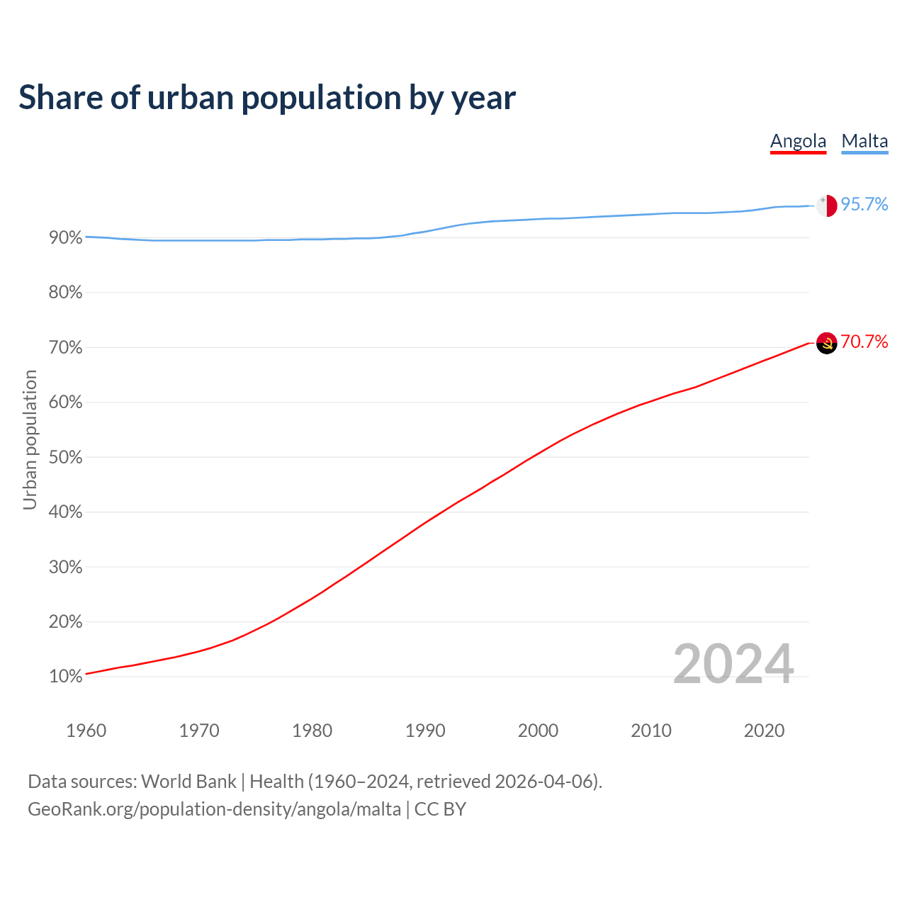 From 2004 to 2024, the share of urban population changed from 55% to 70.7% in Angola and from 93.6% to 95.7% in Malta.