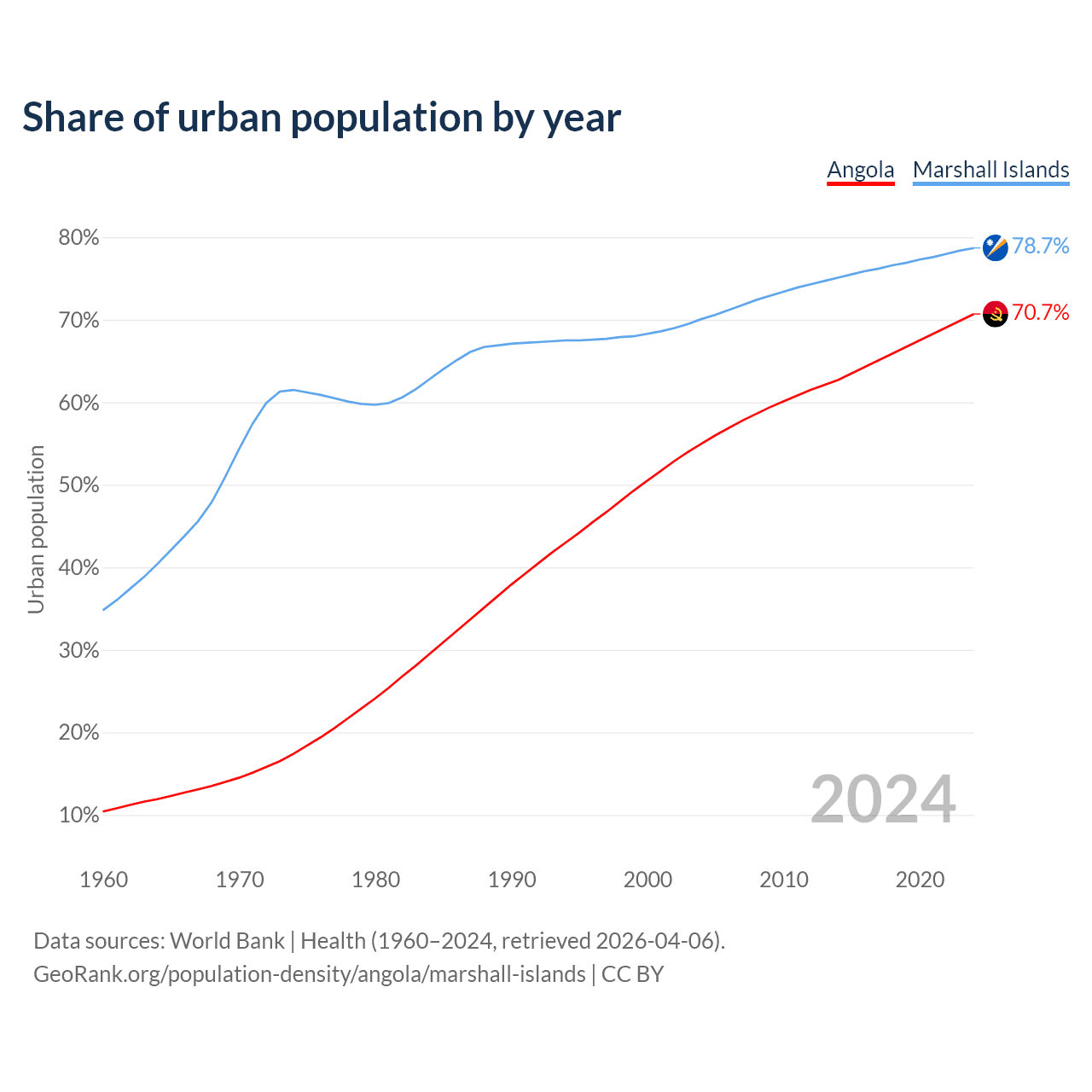 From 2004 to 2024, the share of urban population changed from 55% to 70.7% in Angola and from 70.1% to 78.7% in the Marshall Islands.