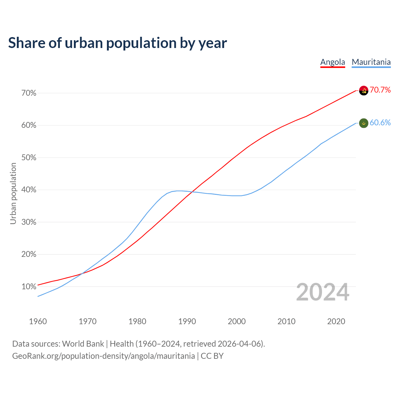 From 2004 to 2024, the share of urban population changed from 55% to 70.7% in Angola and from 39.6% to 60.6% in Mauritania.