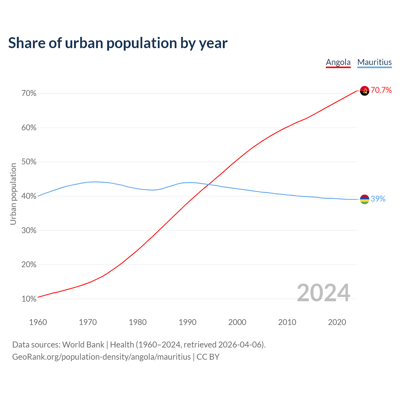 From 2004 to 2024, the share of urban population changed from 55% to 70.7% in Angola and from 41.3% to 39% in Mauritius.