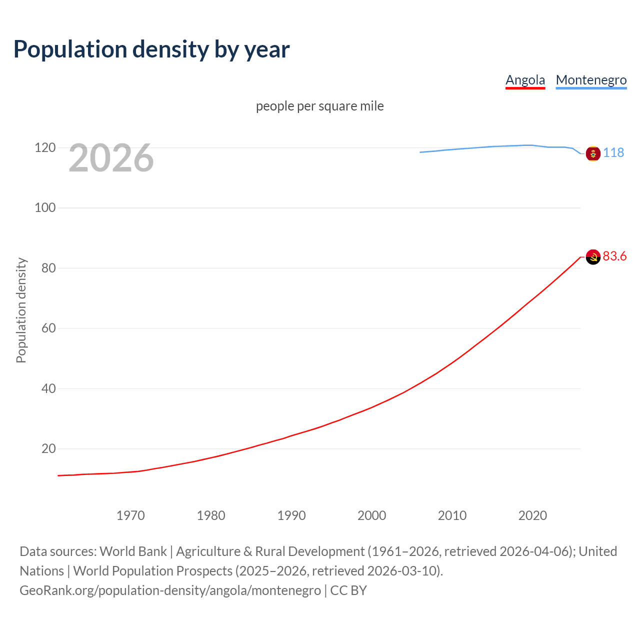 From 2006 to 2026, population density in Angola increased by 101%, compared to a 0.44% decline in Montenegro.
