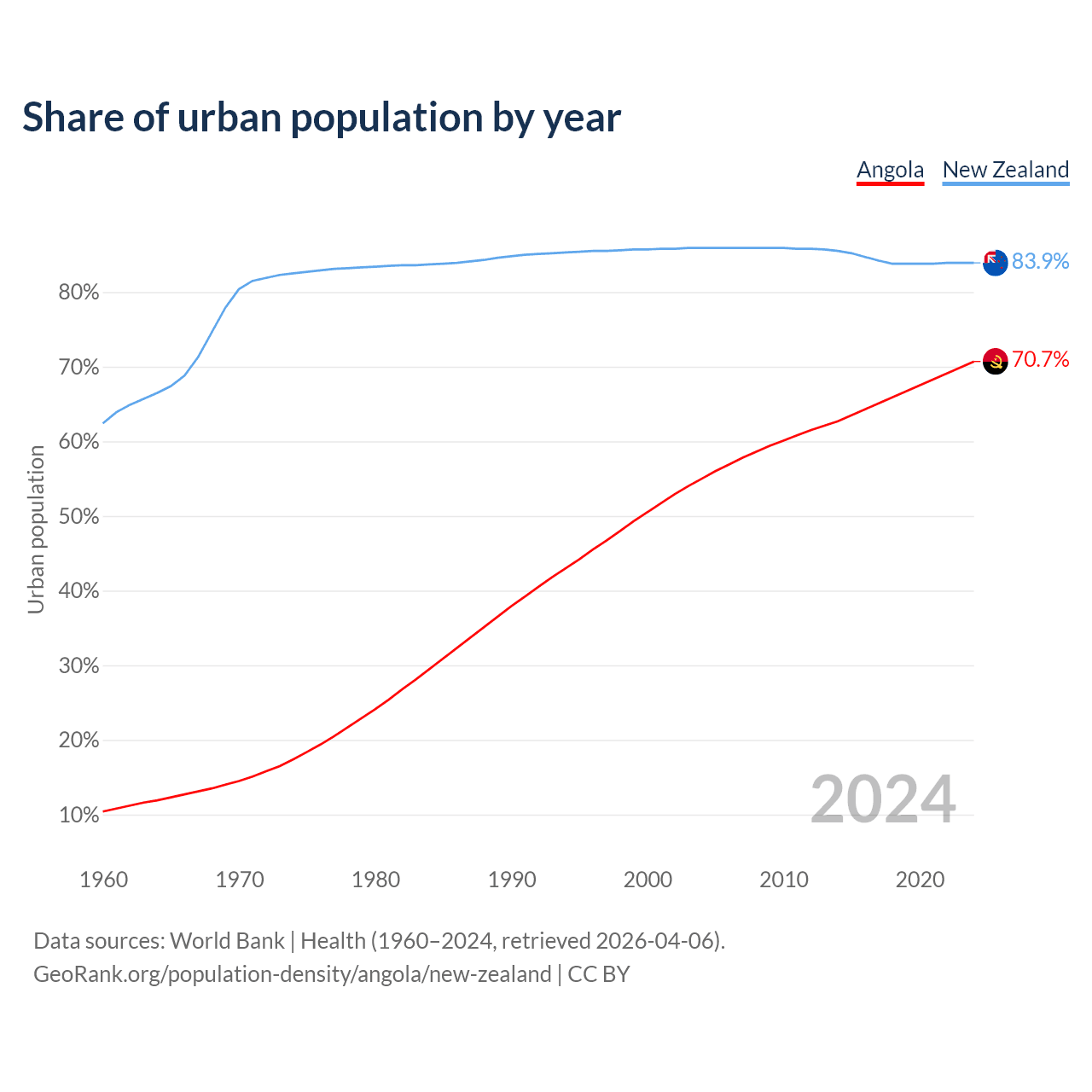 From 2004 to 2024, the share of urban population changed from 55% to 70.7% in Angola and from 85.9% to 83.9% in New Zealand.