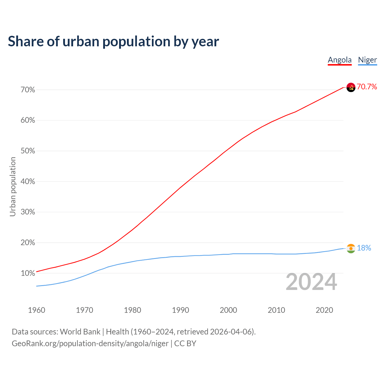 From 2004 to 2024, the share of urban population changed from 55% to 70.7% in Angola and from 16.3% to 18% in Niger.