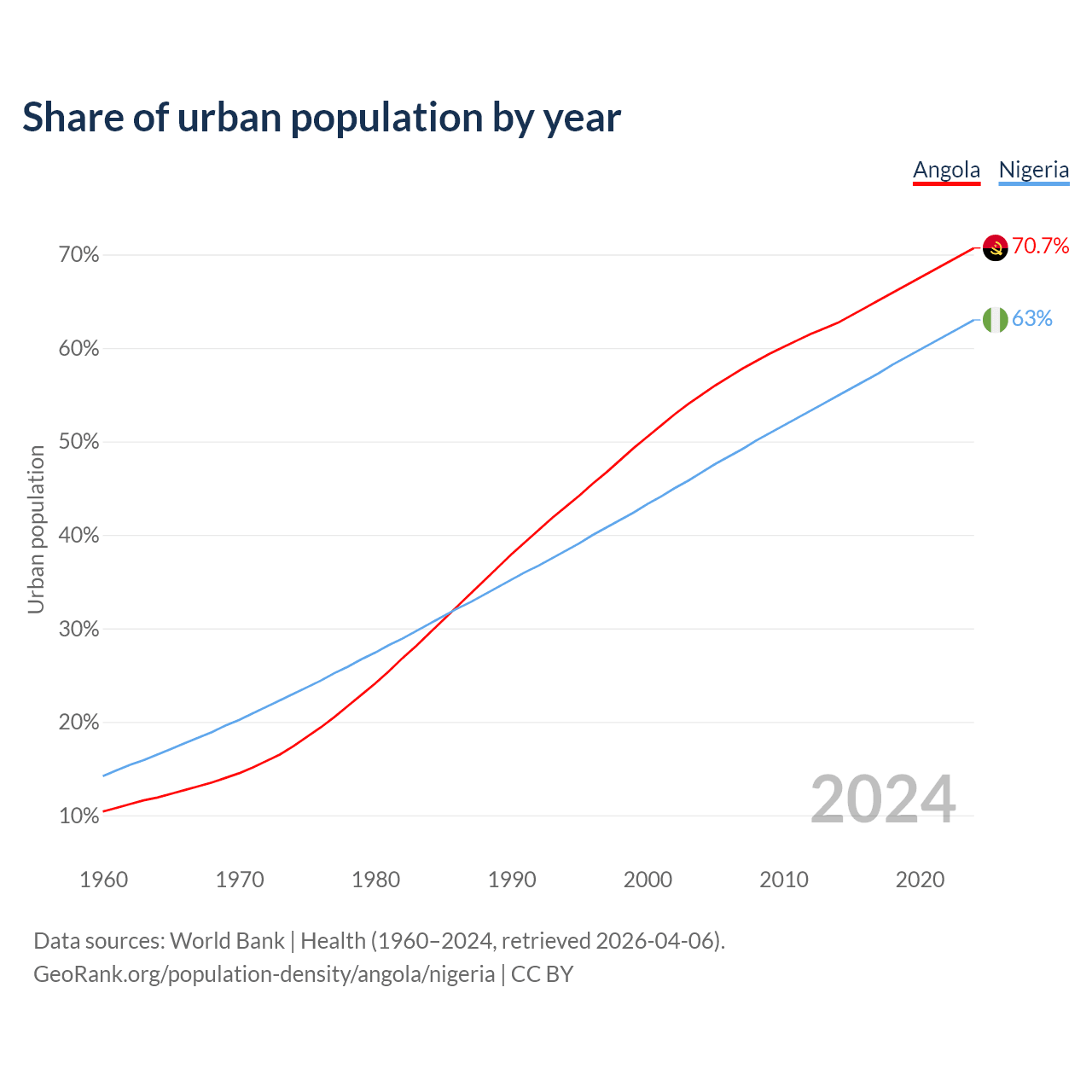 From 2004 to 2024, the share of urban population changed from 55% to 70.7% in Angola and from 46.7% to 63% in Nigeria.