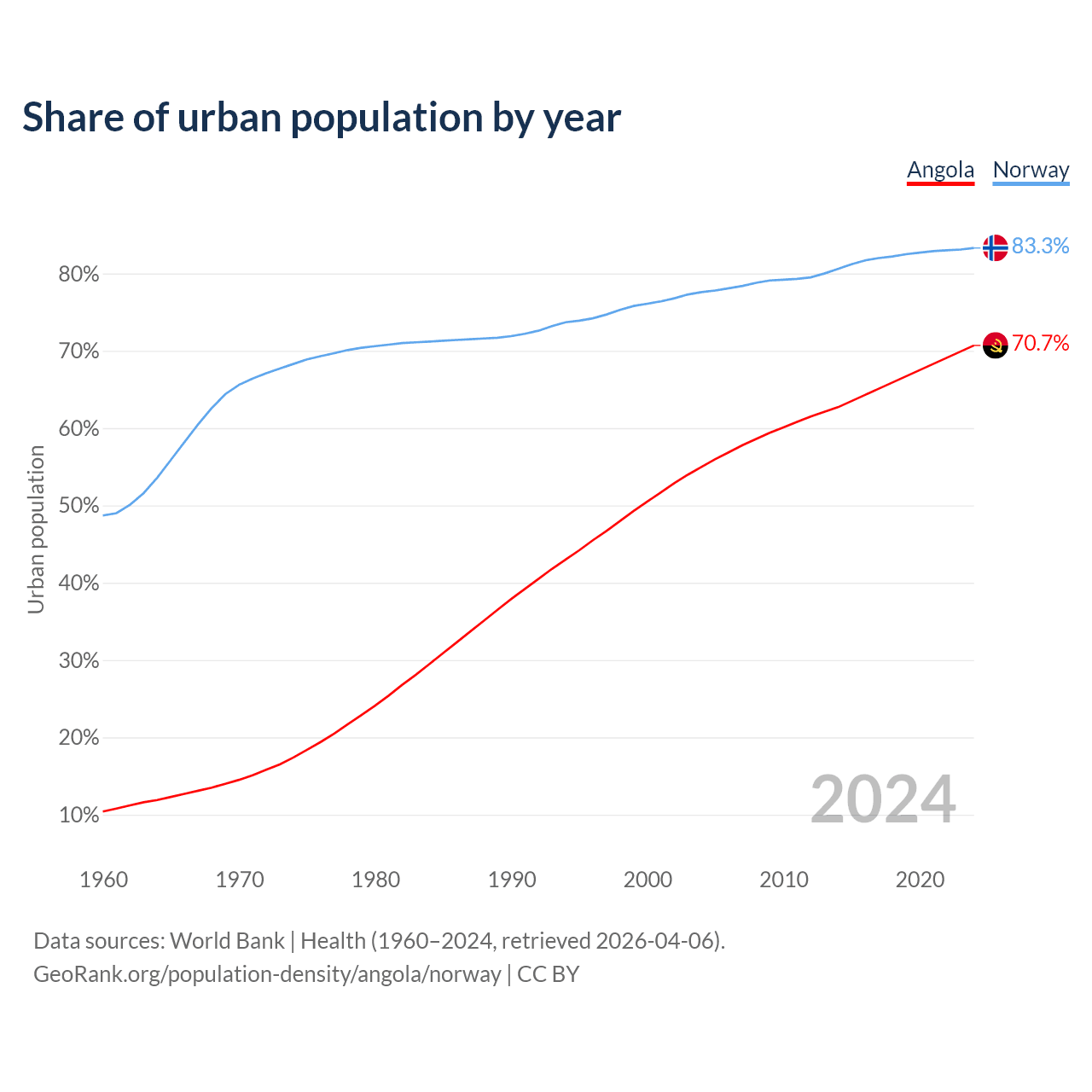 From 2004 to 2024, the share of urban population changed from 55% to 70.7% in Angola and from 77.6% to 83.3% in Norway.