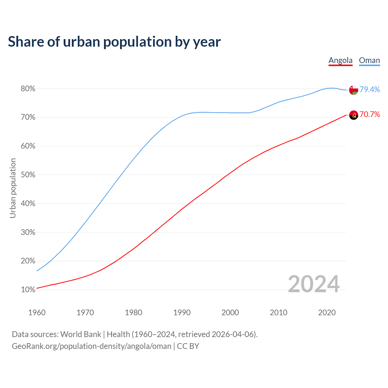From 2004 to 2024, the share of urban population changed from 55% to 70.7% in Angola and from 71.5% to 79.4% in Oman.